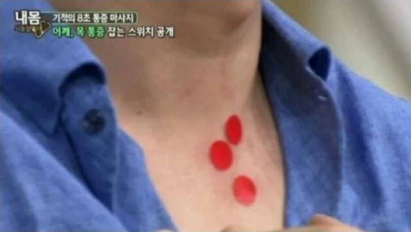 쇄골이 시작되는 곳 정중앙과 그 위아래를 지압해주면 어깨와 목의 통증을 잡아줄 수 있음.