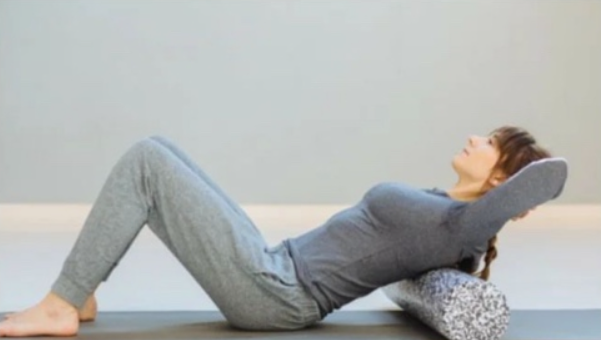 무릎을 굽히고 엉덩이를 붙인 상태에서 허리 뒤에 폼롤러를 끼어준다. 그리고 두 손은 뒤로 깍지껴주고, 복부에ㅐ 긴장을 준 상태에서 무릎을 구부렸다 폈다하면 허리가 시원해짐.