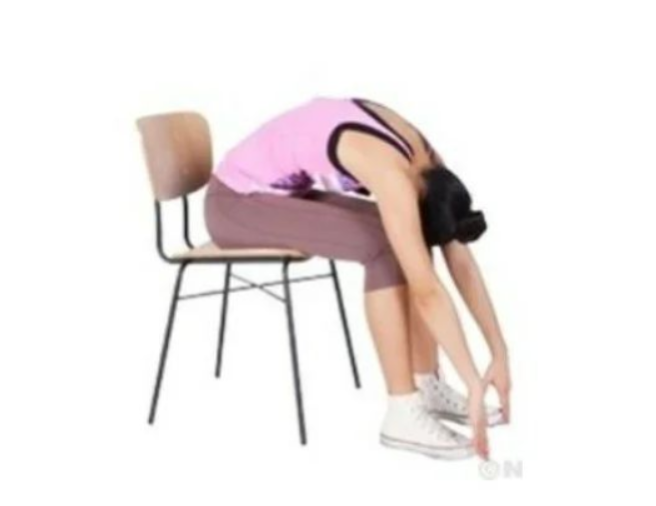 의자에 앉아 상체를 숙이면 허리 및 등의 부분의 긴장을 풀어줄 수 있으며, 혈액순환 개선에 도움이 됨.