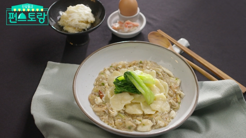 9. 그릇에 게살 볶음을 담고, 삶은 수제비를 올려준다. 데쳐놓은 청경채를 중앙에 올려주면 완성!