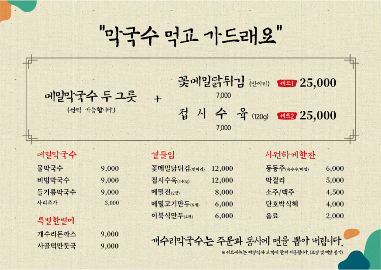 메뉴 : 물막국수, 비빔막국수, 들기름막국수 각 9천원씩