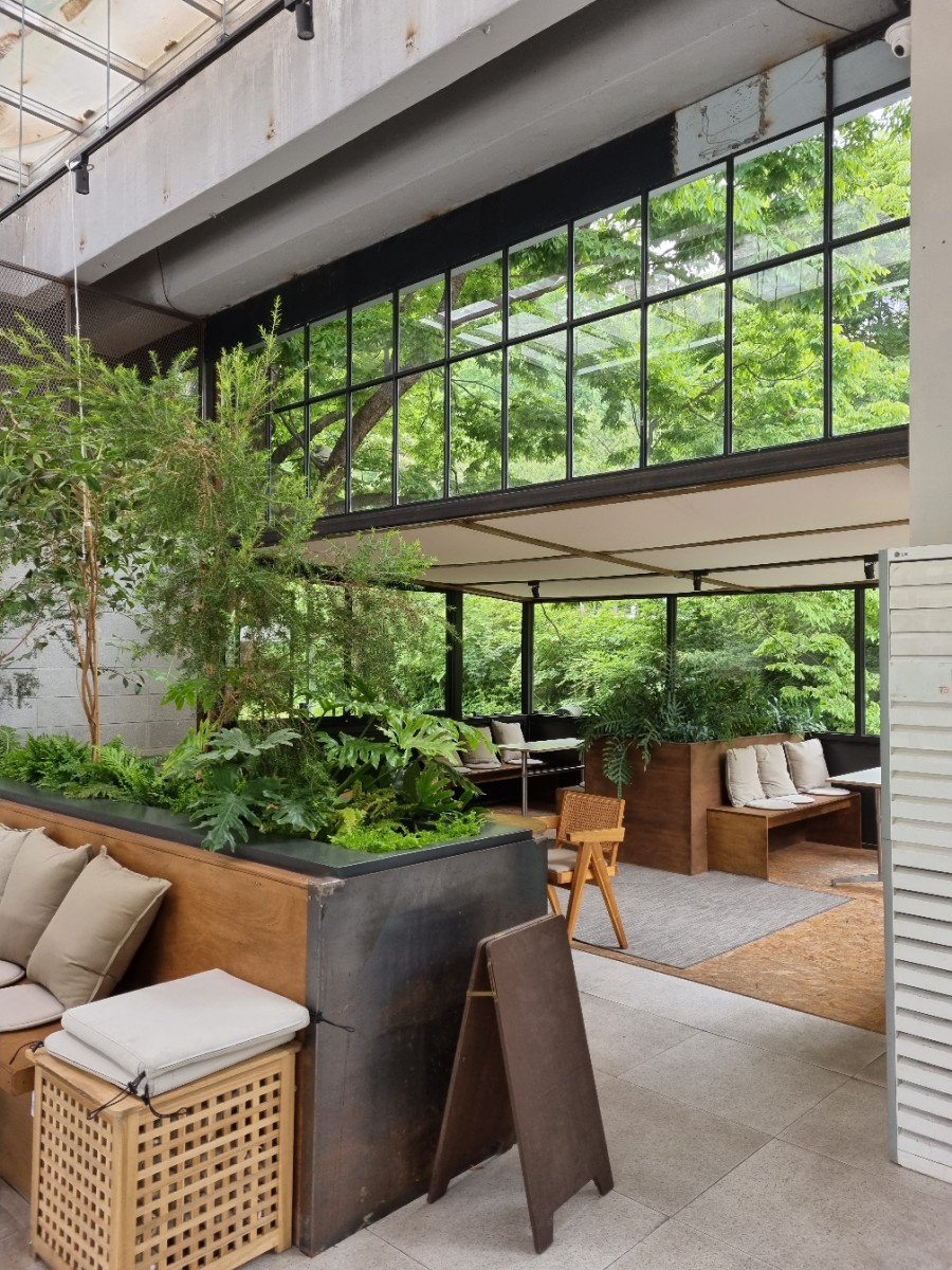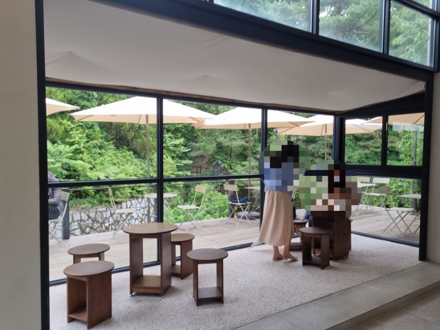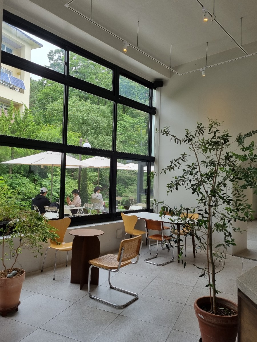 이 통창으로 보이는 푸른 나무들과
