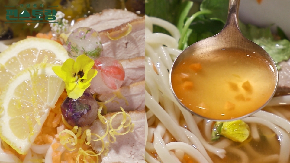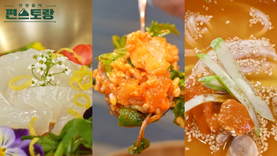 회, 냉면 육수, 미나리, 식용 꽃, 레몬 제스트, 만능 과일 비빔장