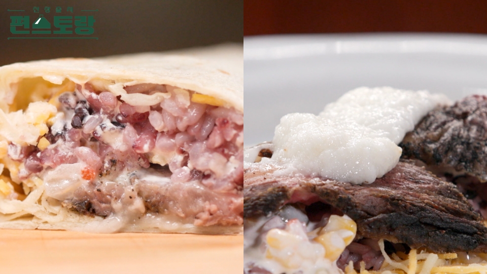 3. 구운 토르티야 위에 슈레드 치즈 → 흑미밥 → 사워크림소스 → 마즙 → 갈빗살 순으로 올려 마무리한다.