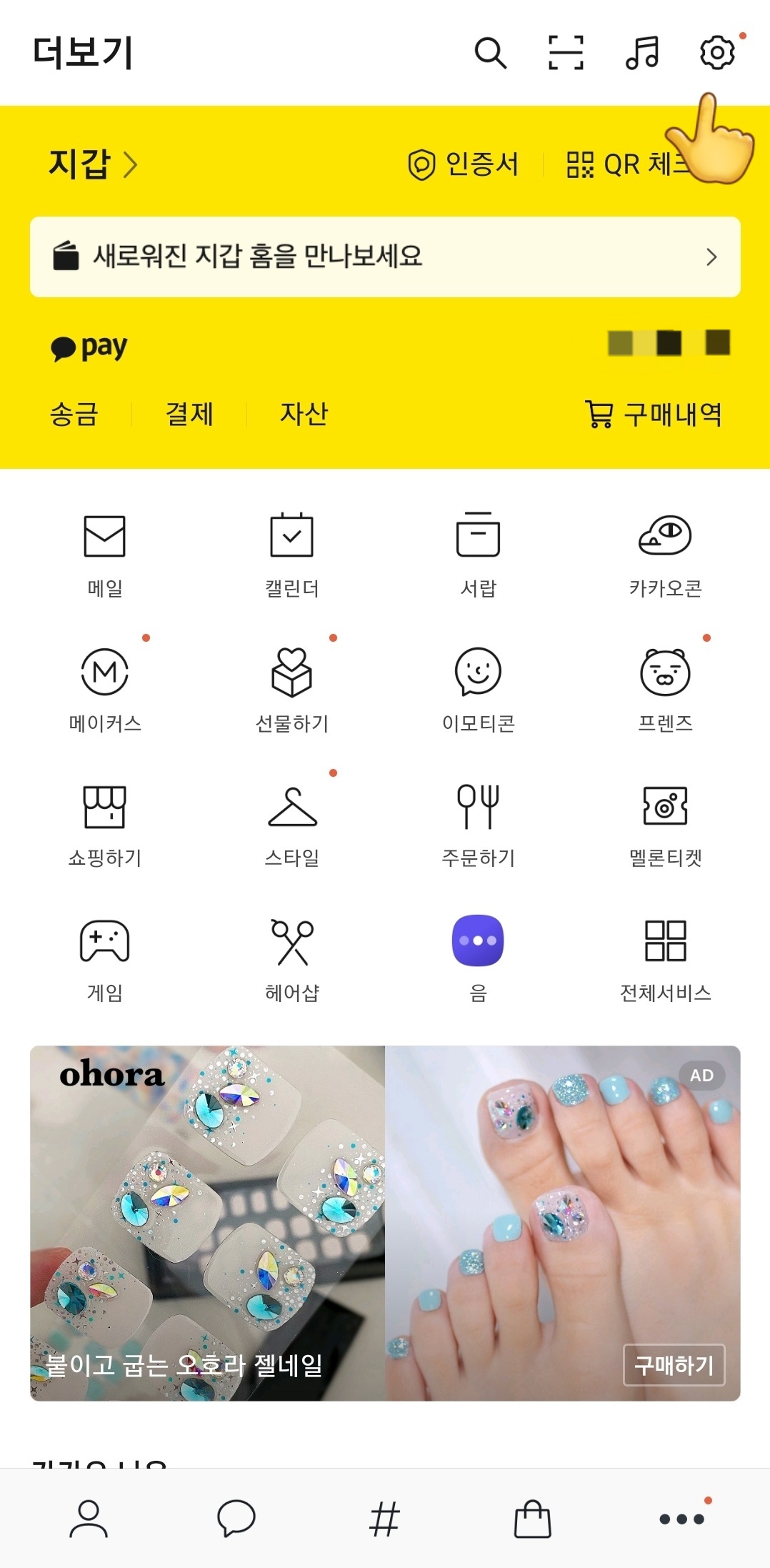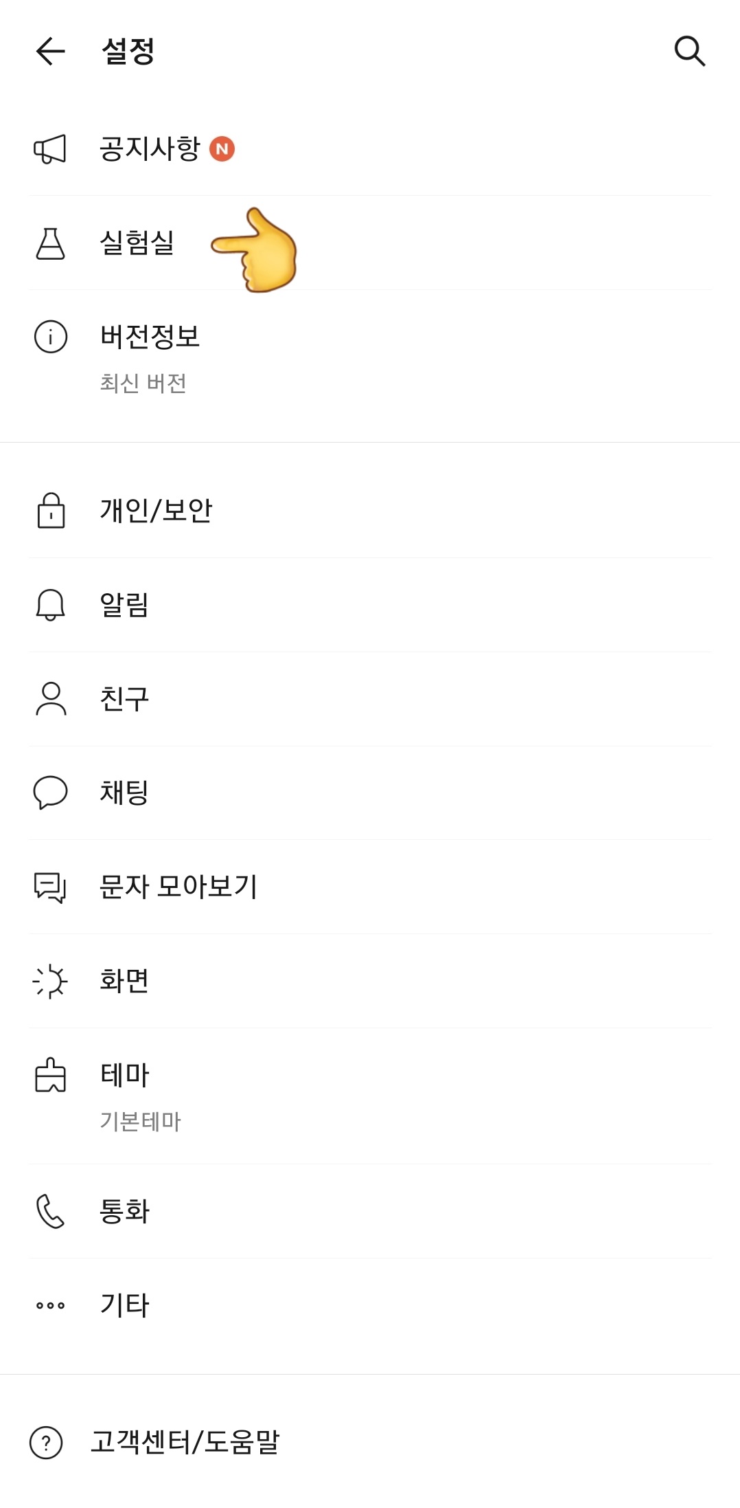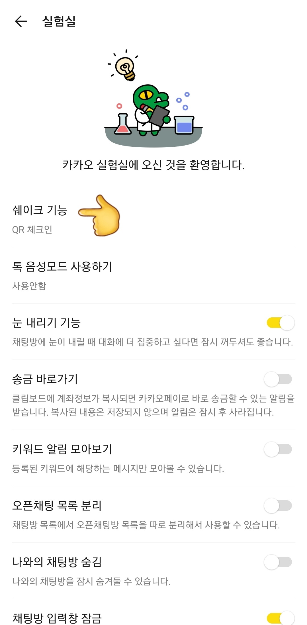 1) 카카오톡 더보기에서 설정 선택하면 상단에 실험실이 나온다