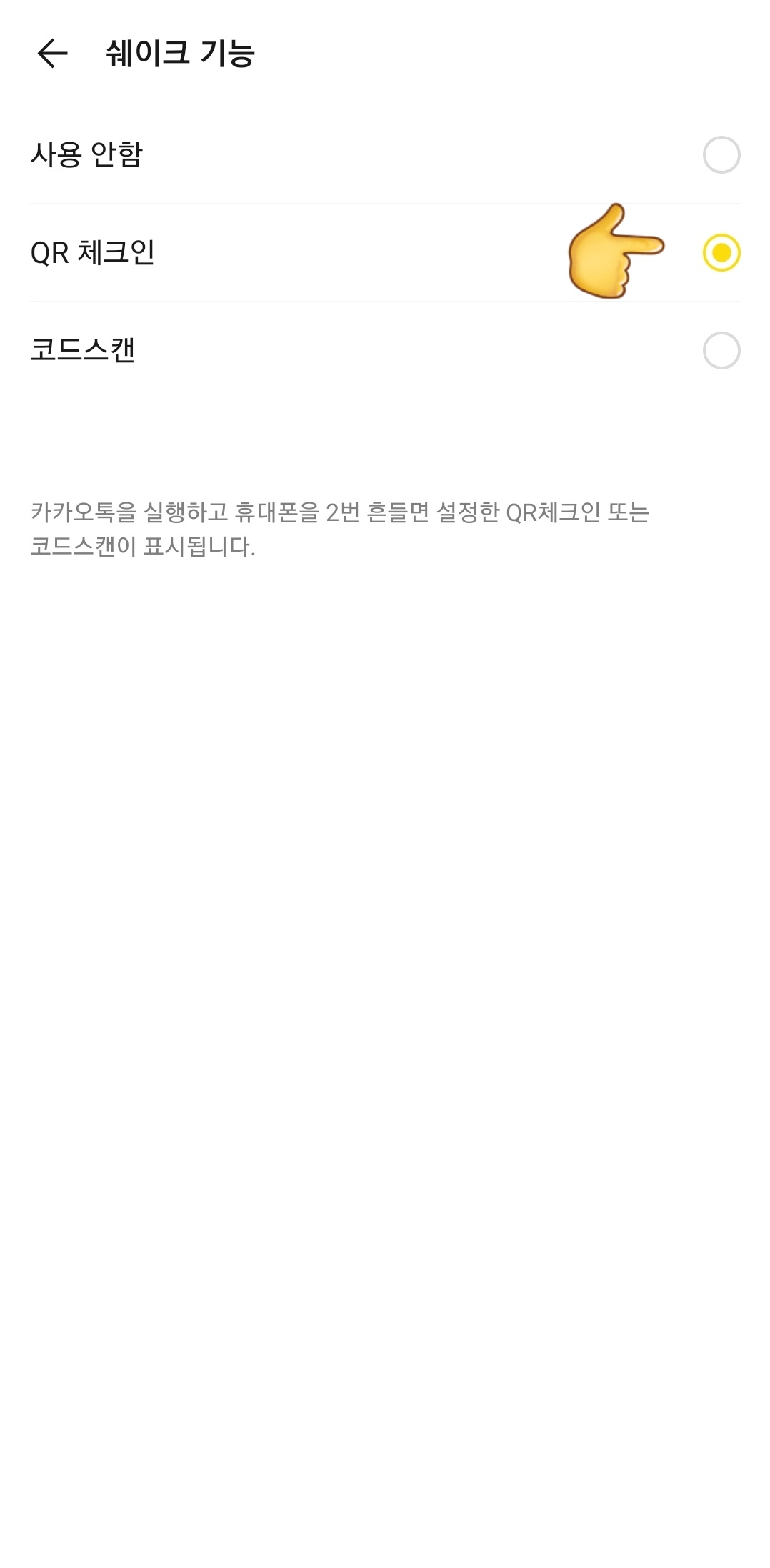 쉐이크 기능에서 QR코드를 선택한다