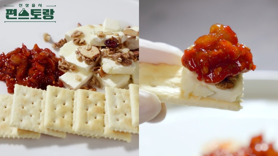 4. 크래커, 꿀 크림치즈, 창난젓을 다함께 올려서 한 입에 드시면 이색 조합의 카나페를 맛보실 수 있습니다.
