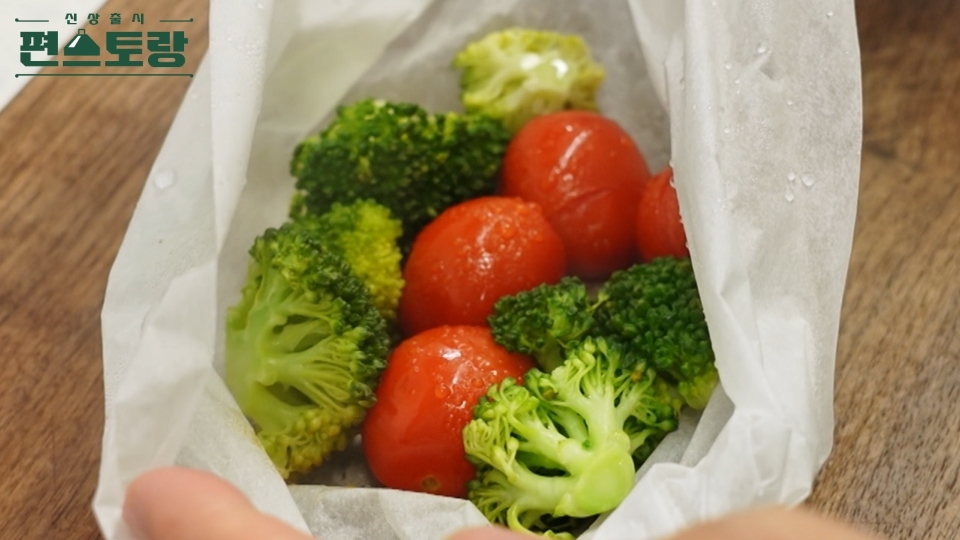 2. 종이호일에 넣은 브로콜리, 방울토마토를 프라이팬에 올리고, 중불에서 뚜껑 덮고 10분 동안 익힌다.