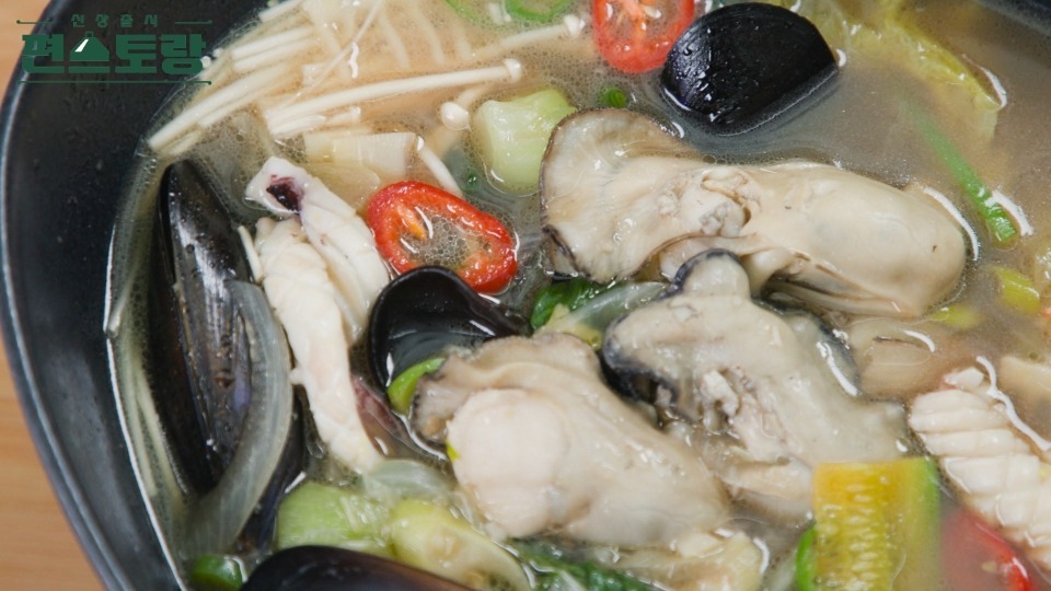 6. 국물이 팔팔 끓어오르면 오징어와 손질한 굴을 넣고 적당히 통통해질 때까지 한소끔 끓여주면 완성!
