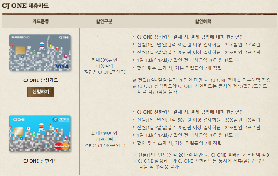 - CJ ONE 삼성카드와 CJ ONE 신한카드는 동시에 제휴(할인/포인트/더블 적립) 적용 불가