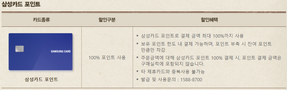 - 주문금액에 대해 삼성카드 포인트 100% 결제 시, 포인트 결제 금액은 구매실적이 미포함