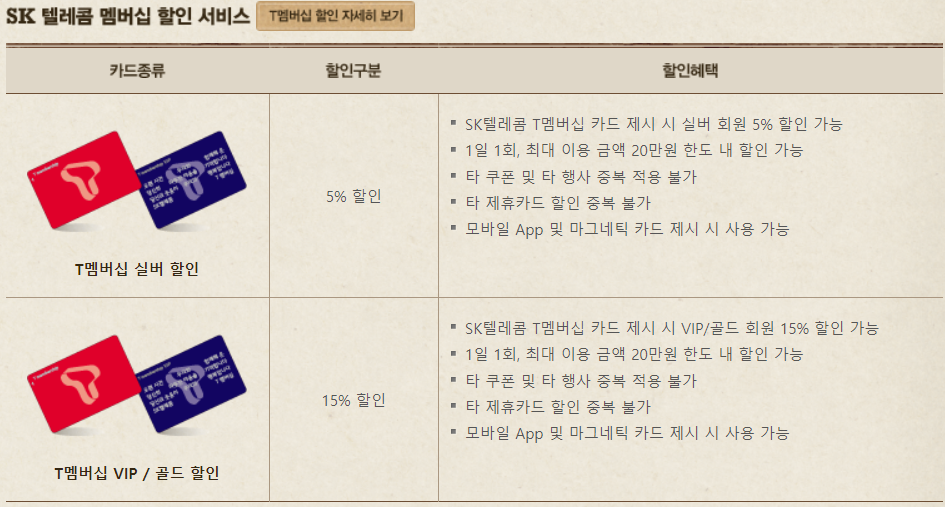 SK 텔레콤 멤버십은 실버 5% 할인, VIP / 골드 15% 할인이 적용된다