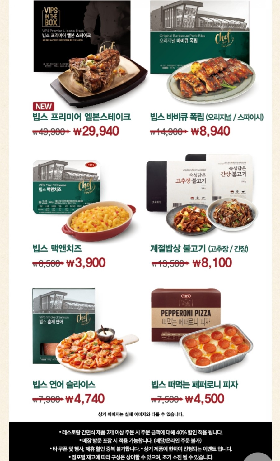 - 레스토랑 간편식 제품은 2개 이상 주문 시 주문 금액에 대해 40% 할인 적용