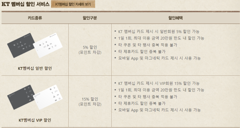 KT 멤버십은 일반은 5% 할인, VIP는 15% 할인 (모두 포인트 차감)이 가능하다