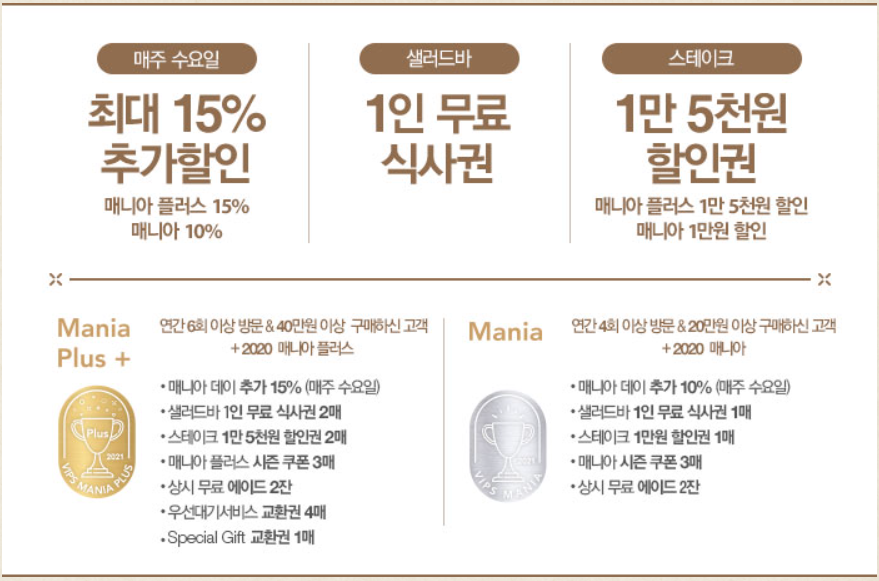 - 매주 수요일 할인 : 매니아 플러스 최대 15% / 매니아 10%