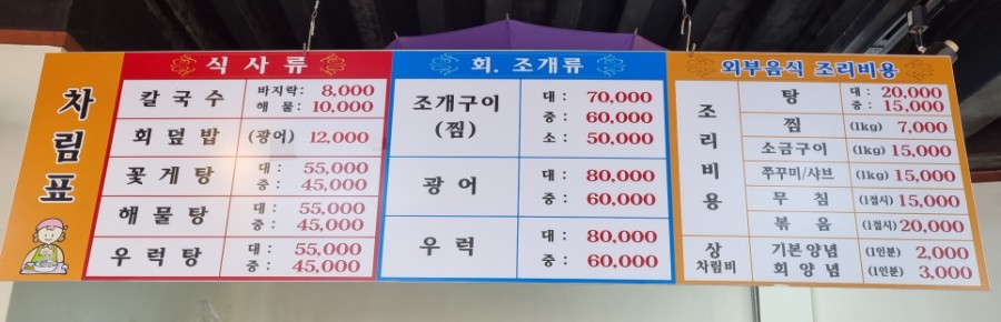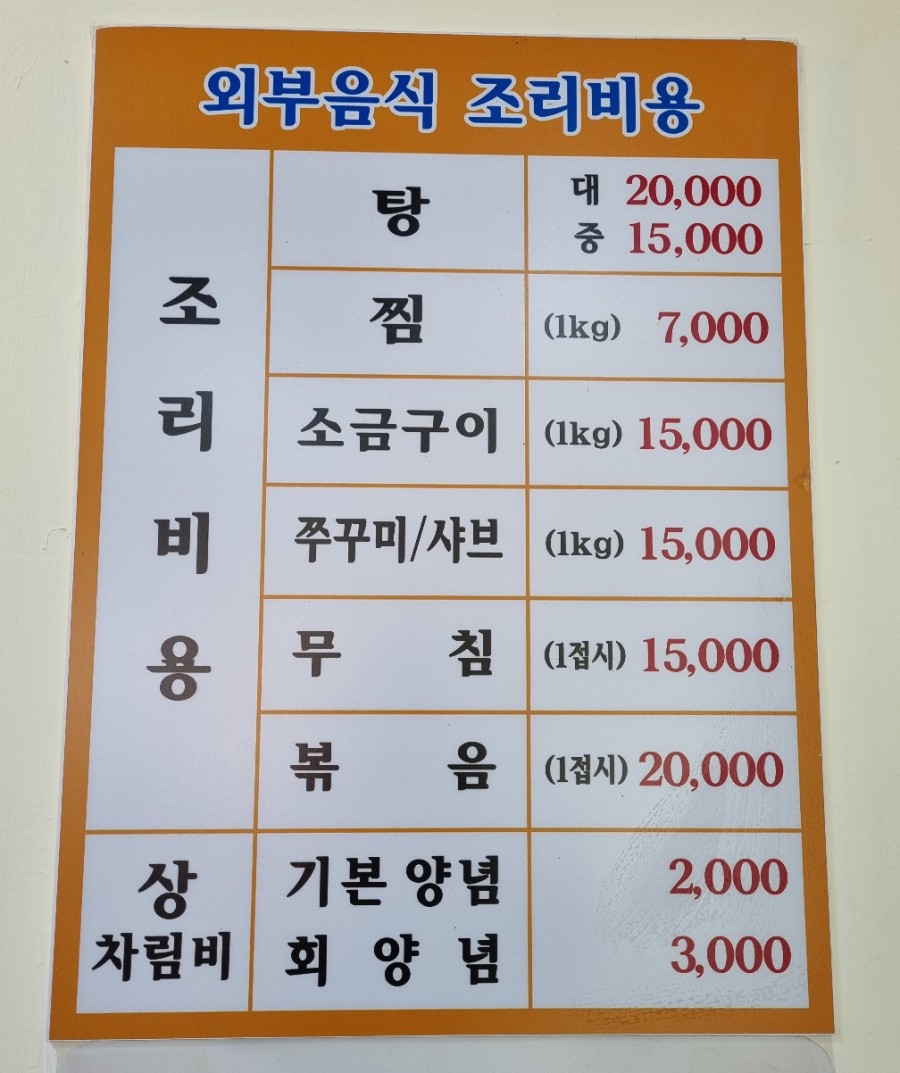 판매 메뉴판과 외부음식 조리비용 메뉴판