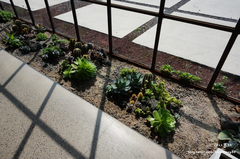 1층 창가 앞 긴 벤치에 앉았는데 앞에 선인장과 다육이들의 미니 정원이 있다