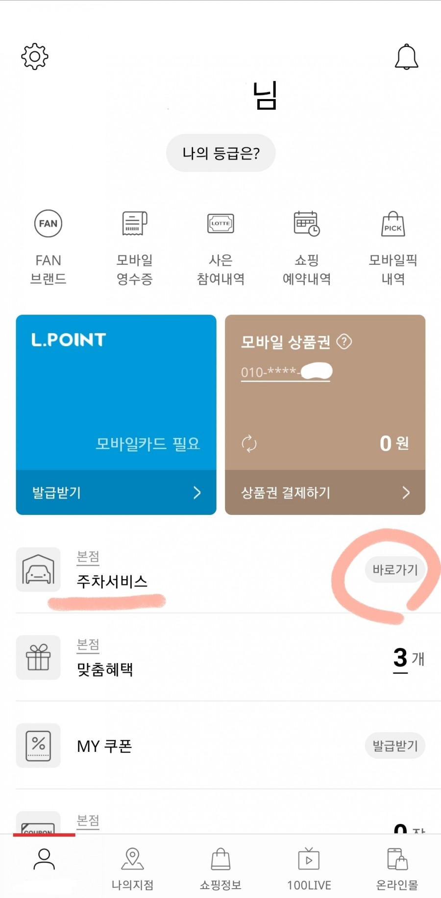 롯데백화점 어플 하단 왼쪽 마이 롯데 클릭