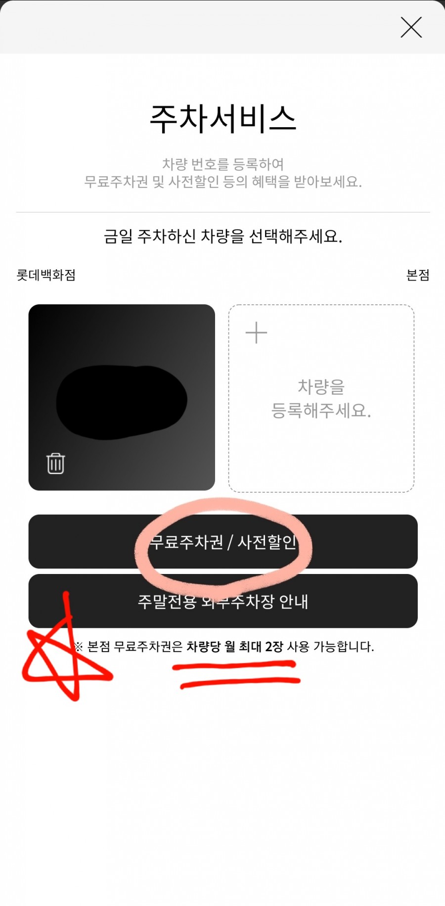 5) 무료주차권 선택 (한 달에 2장까지 사용 가능)