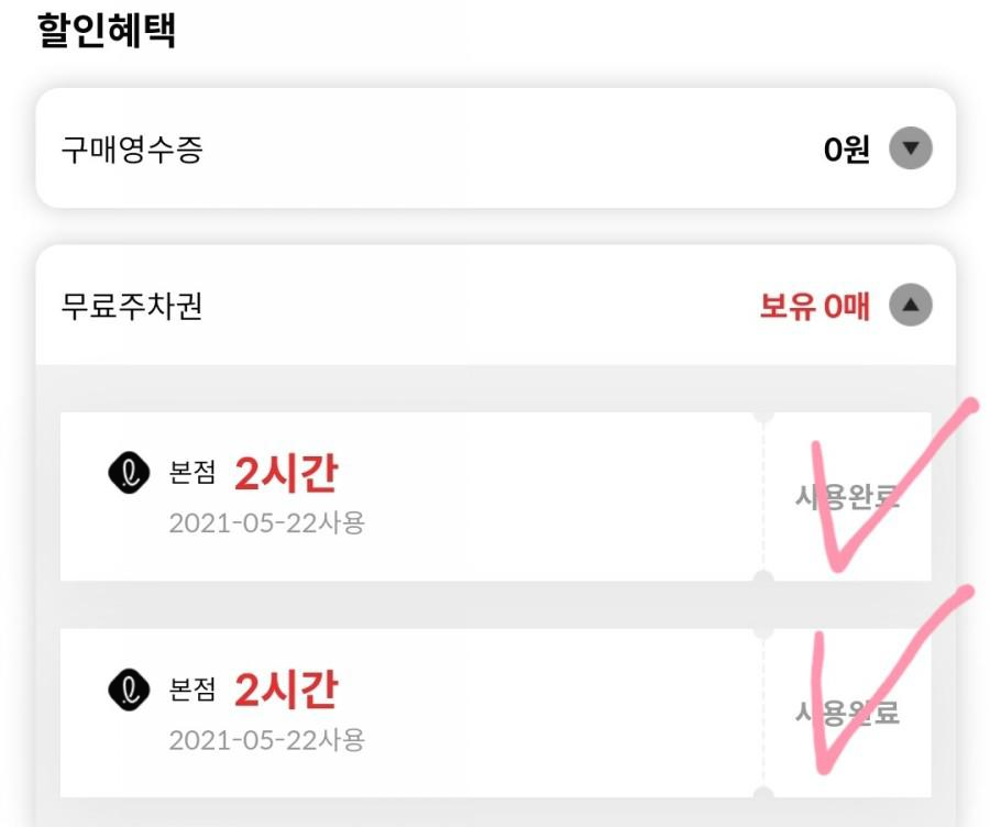 (저는 3시간이 필요하여 2장 동시 사용으로 총 4시간 무료주차 혜택을 받았다)