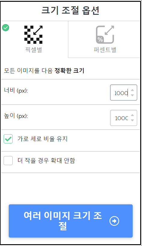 이미지 크기 조절 → 이미지 불러오기 → 픽셀별 → 가로세로비율유지 해지 → 너비,높이 1000 변경→ 맨아래 여러 이미지 크기조절 클릭 → 이미지 다운