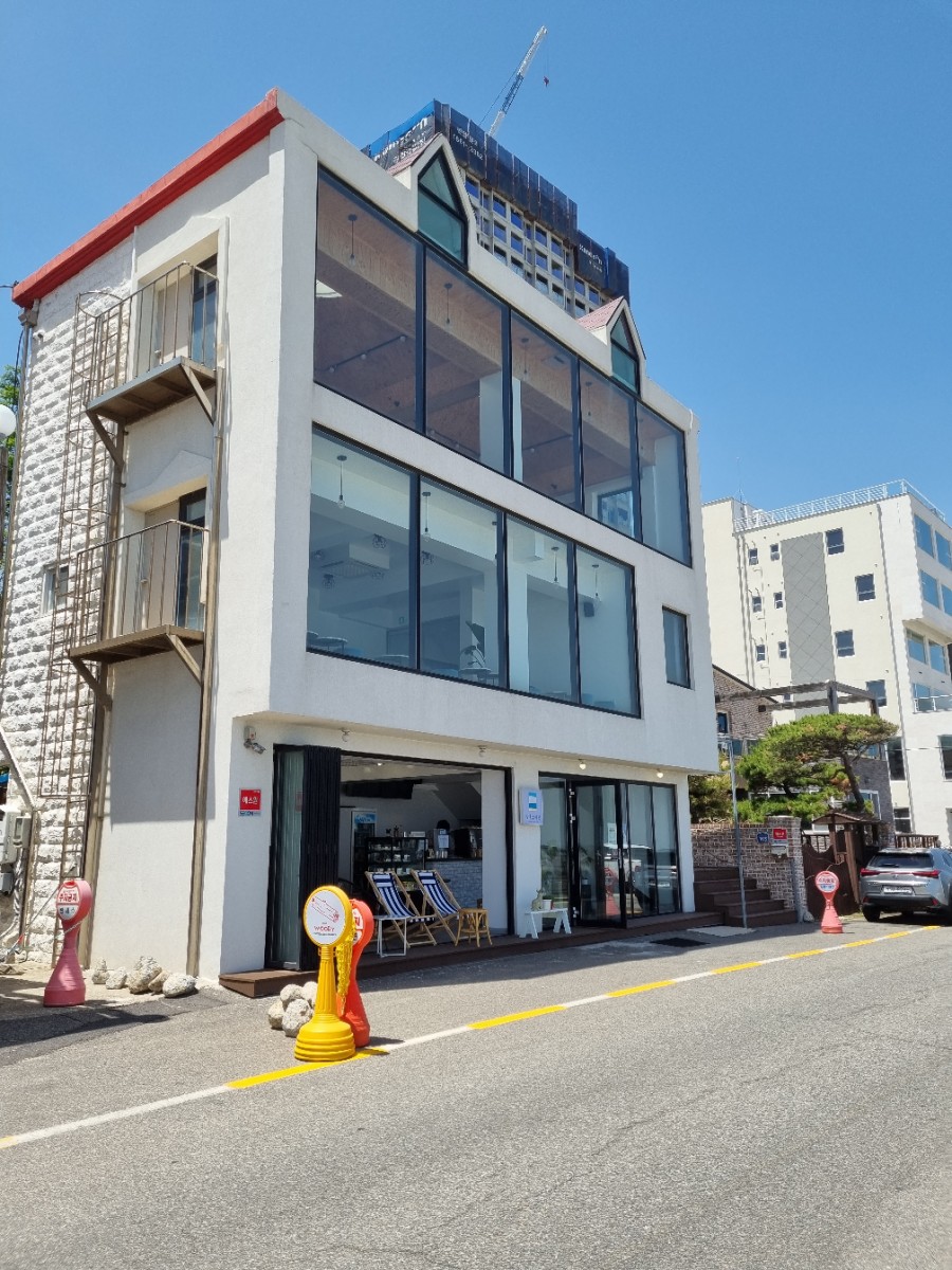 건물 앞에 도로가 있고 바로 해안가와 바다가 있다