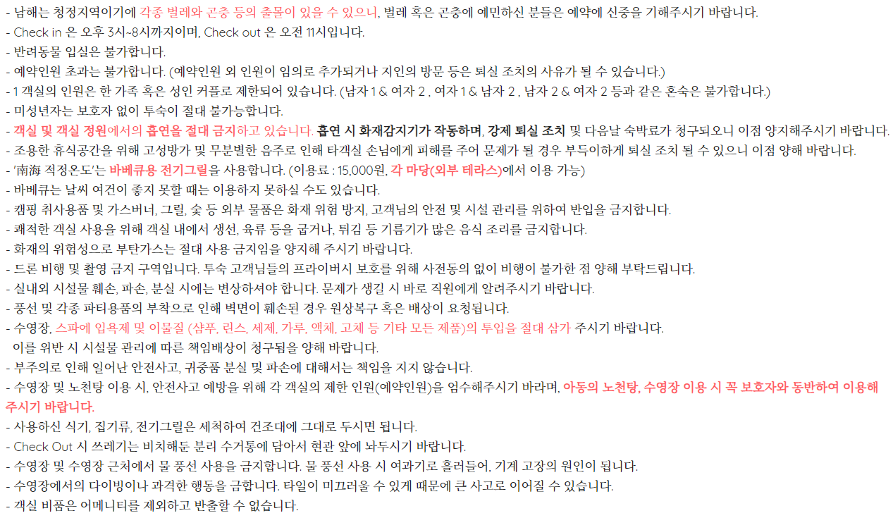 ▶ 남해는 청정지역이기에 각종 벌레와 곤충 등의 출몰이 있을 수 있으니, 벌레 혹은 곤충에 예민하신 분들은 예약에 신중을 기해주시기 바랍니다.